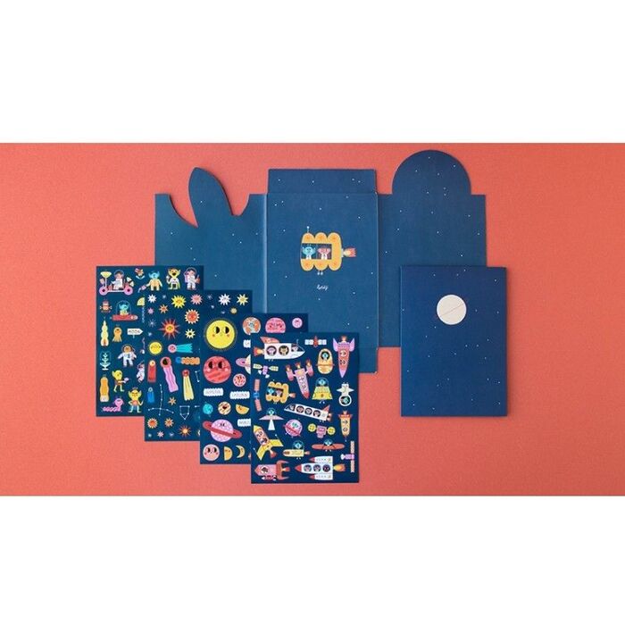 Un juego de 150 pegatinas extraíbles para vehículos espaciales con diferentes personajes, satélites, planetas, constelaciones y estrellas de todo tipo para que construyas tu cielo favorito en el escenario que elijas!