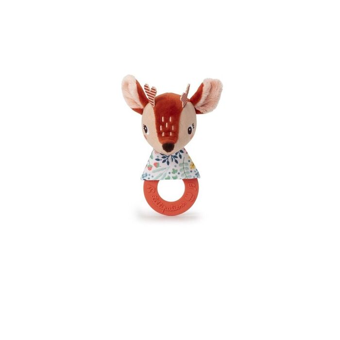 Cuando empiezan a salir los primeros dientes del bebE, Stella corre para ayudar. Su suave anillo de denticiOn alivia el dolor y su alegre sonajero distrae al bebE.