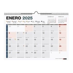 Calendario de pared con espiral doble y pieza para colgar, en papel de 140 g/m² FSC Mix Credit. Contenido: calendario anual en el dorso de cada mes, 12 meses con espacio para anotar (enero-diciembre 2025), festivos nacionales, de comunidades autónomas y de capitales de provincia, onomástica, fases lunares, signos del zodíaco, horario de salida y puesta de sol, días transcurridos y pendientes en cada mes, cambio de estación y hora, calendario de 2026 y carátula explicativa.