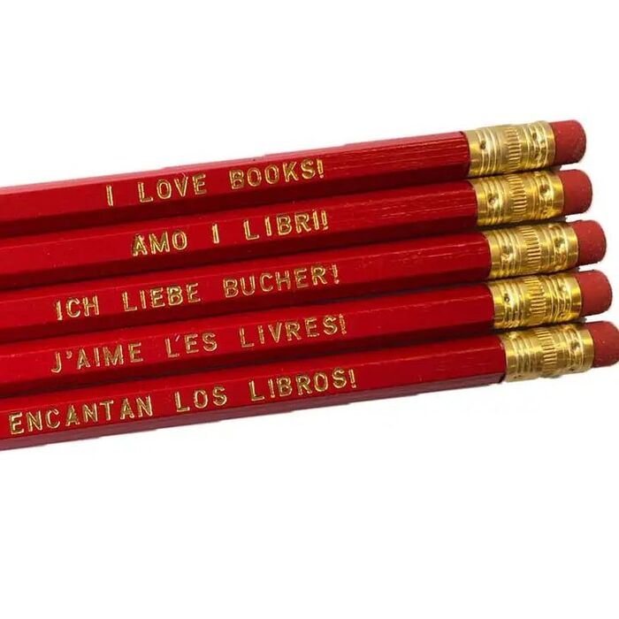 Lápices gramaticales inspirados en nuestros muchos otros productos divertidos con temas gramaticales: tarjetas de felicitación, tazas de café y cuadernos.